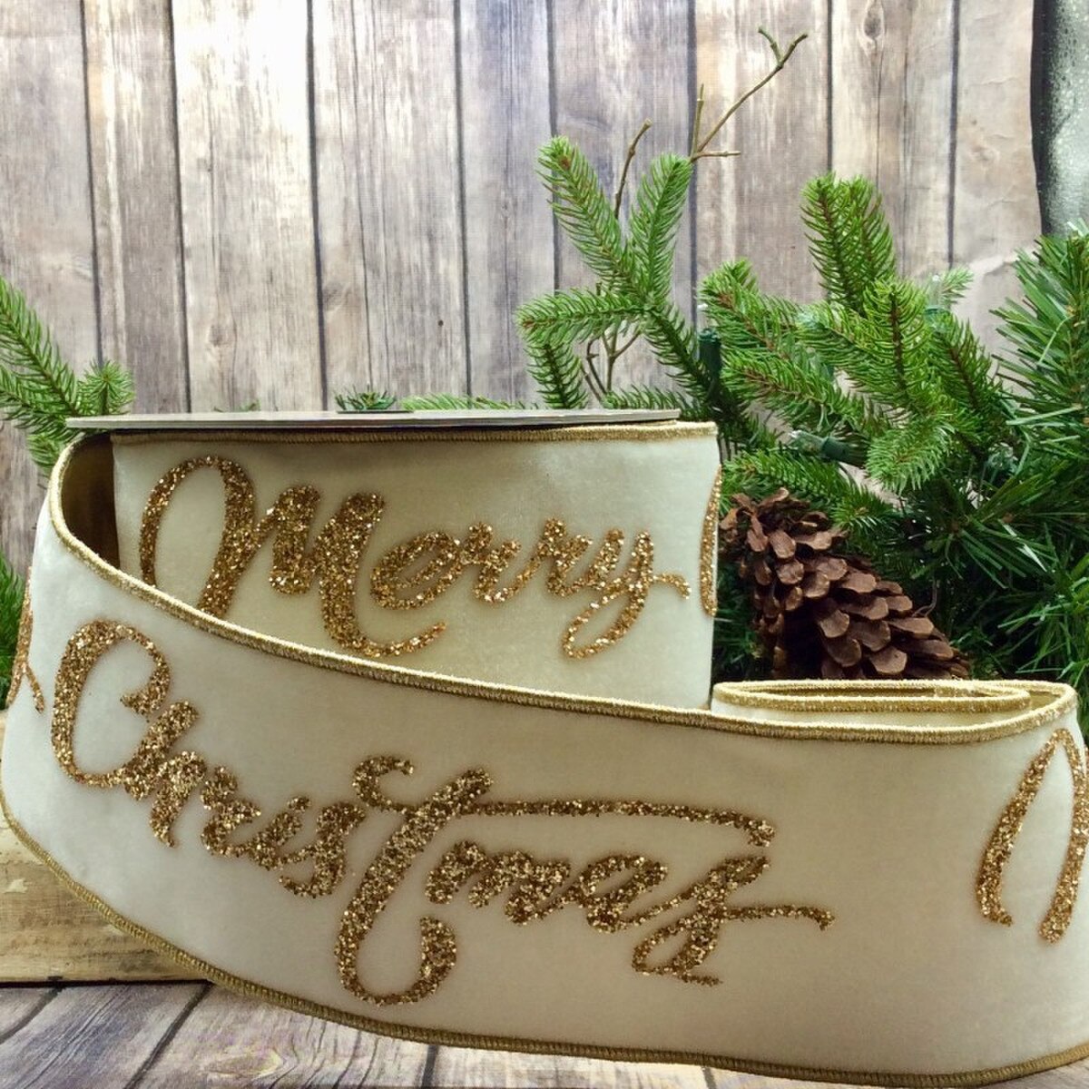 LISTON 4'' X 10 YD TERCIOPELO BLANCO CON ORO MERRY CHRISTMAS