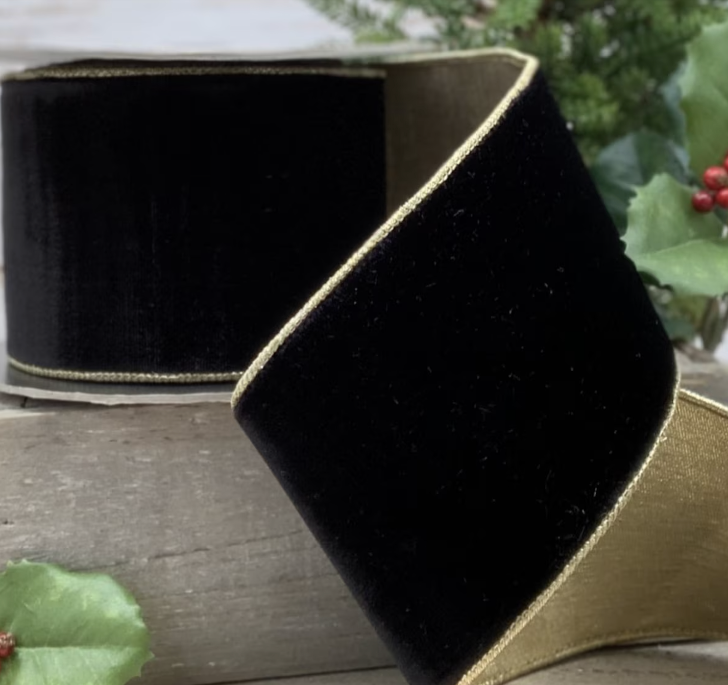 LISTON 4'' X 10 YD TERCIOPELO NEGRO, TRIM ORO Y REVERSO ORO