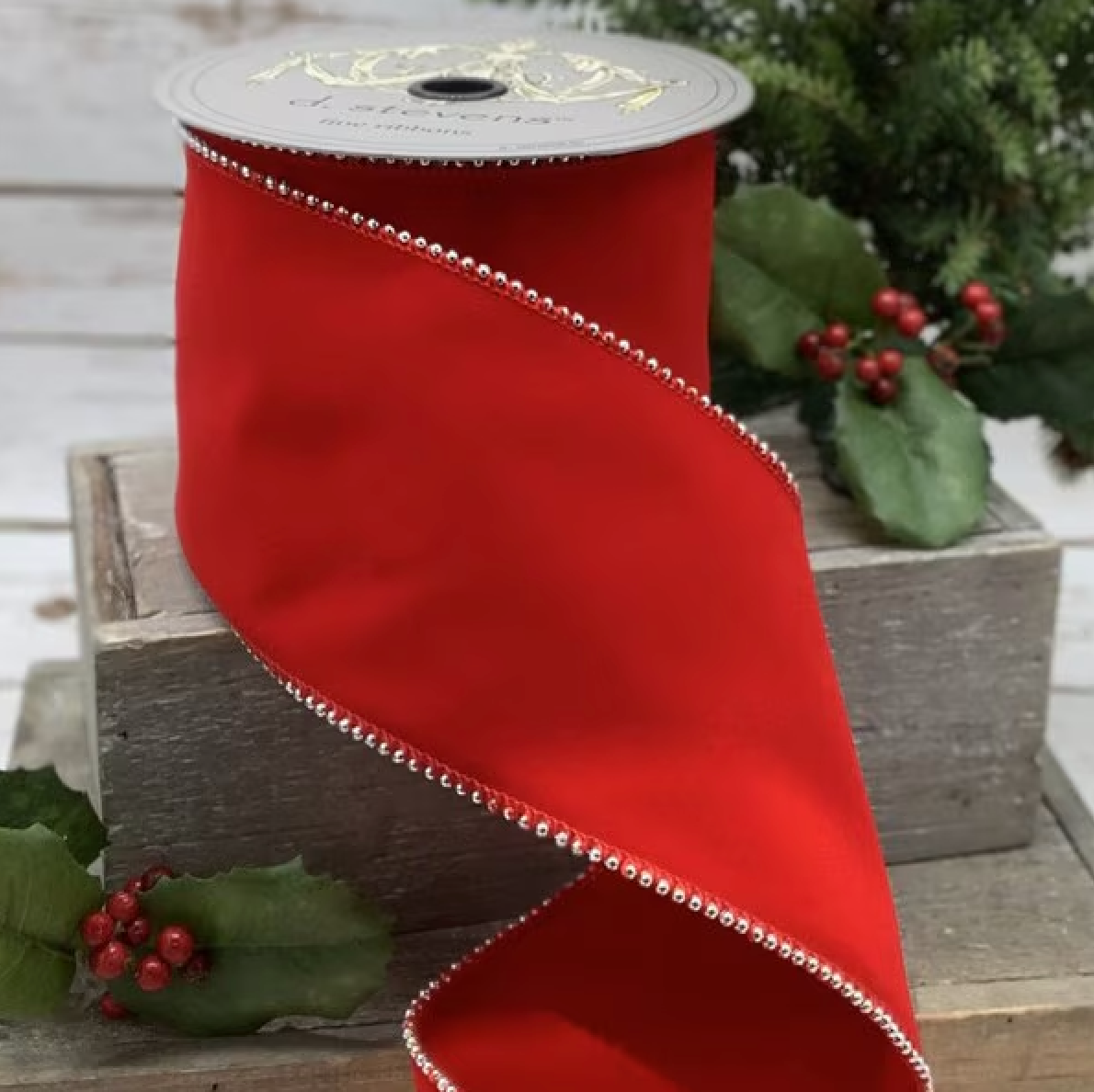 LISTON 4'' X 10 YD TERCIOPELO ROJO AMBOS LADOS, TRIM PIEDRAS PLATA